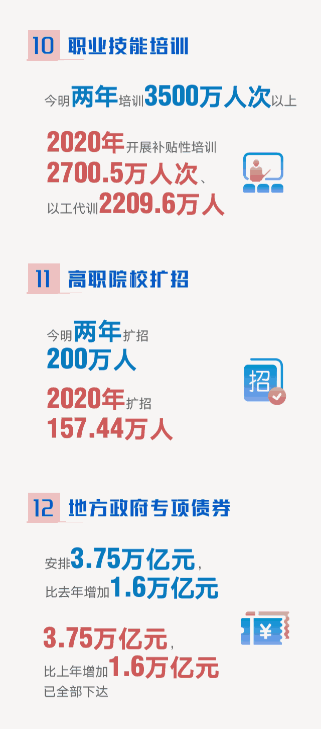 《报告》提出,2020年、2021年两年职业技能培训3500万人次以上,高职院校扩招200万人。任务完成情况显示,2020年全国开展补贴性职业技能培训2700.5万人次、以工代训2209.6万人;高职院校共扩招157.44万人。