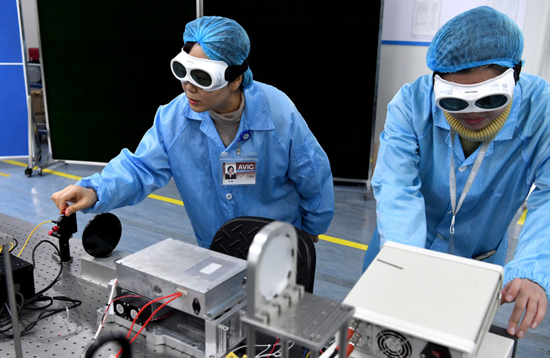 2月25日,在中国航空工业集团公司洛阳电光设备研究所,航空工业集团光电专业特级技术专家羊毅(左)与团队成员在实验室做实验。新华社记者 李安 摄