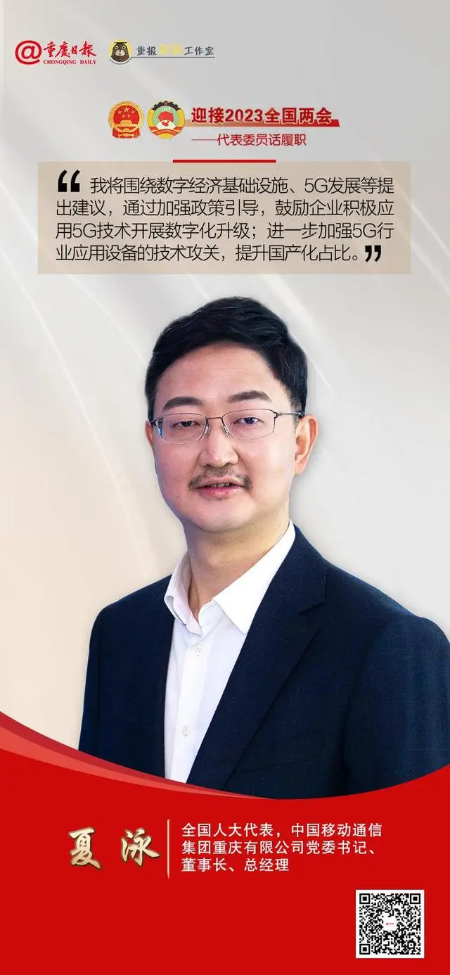 当选全国人大代表,深感责任重大,将围绕数字经济基础设施、5G发展等准备建议。”全国人大代表,中国移动通信集团重庆有限公司党委书记、董事长、总经理夏泳,最近这段时间一直在密集走访调研,为即将召开的全国两会作准备。