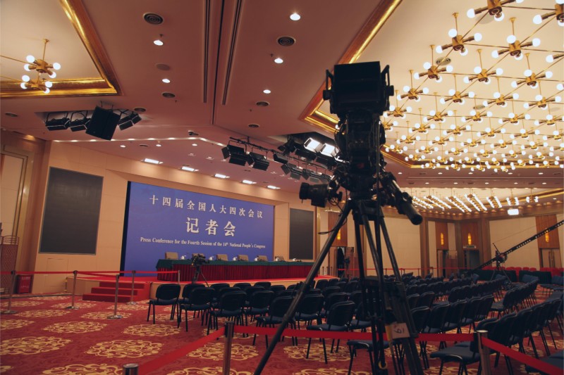 图为,全国两会新闻中心新闻发布厅已经布置完毕。摄影/记者 郑茂典