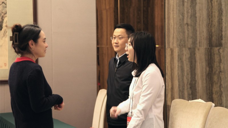 3月3日下午,全国政协十四届四次会议新闻发布会举行前夕,境内外记者互相交流。摄影/记者 郑茂典