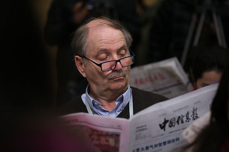 中国近年来的高速发展吸引着全球目光,国外知名媒体纷纷报名申请采访中国两会。图为在3月11日全国政协十二届三次会议举行的记者会上,俄罗斯媒体记者在采访间隙阅读报纸了解更多信息。