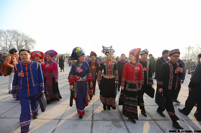 第十三届全国人民代表大会第二次会议5日上午在人民大会堂开幕,来自广西的少数民族代表身着节日盛装步入会场。