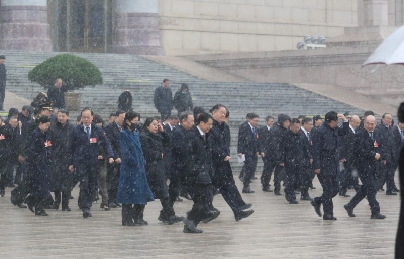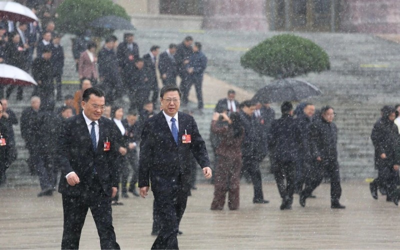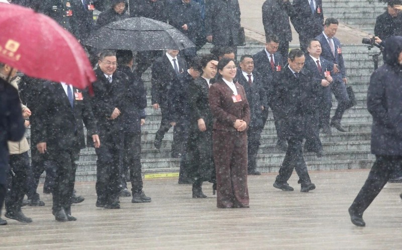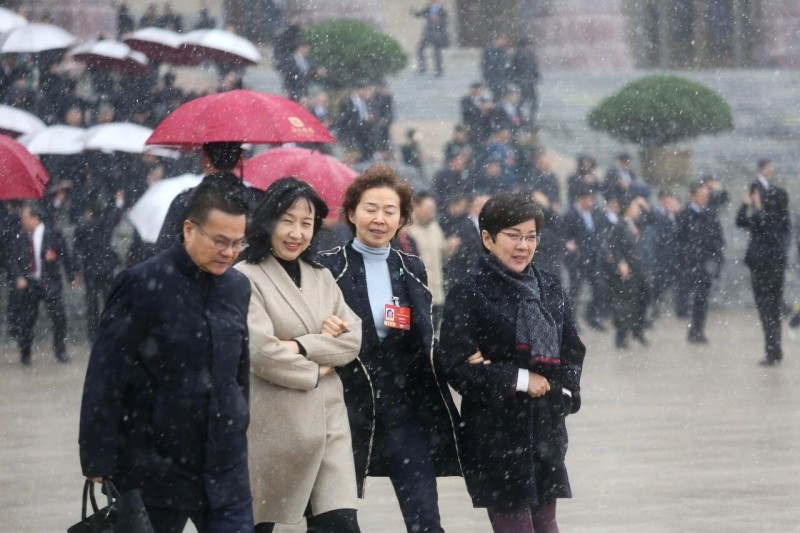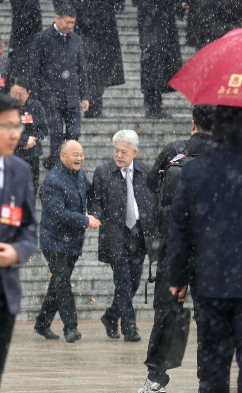 人民大会堂前,洁白的雪花悠悠飘落,整个建筑在浪漫的雪景中更显庄严肃穆。代表们迎着飘雪,漫步在广场上,一边热络问好,一边积极地交流着想法。洁白的雪、庄严的殿堂与代表们活跃友好的身影,构成了一幅和谐的画面。