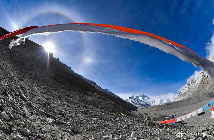5月1日,珠穆朗玛峰山区上空出现日晕景观。在珠峰大本营的新华社记者拍摄下了这一迷人景象。
