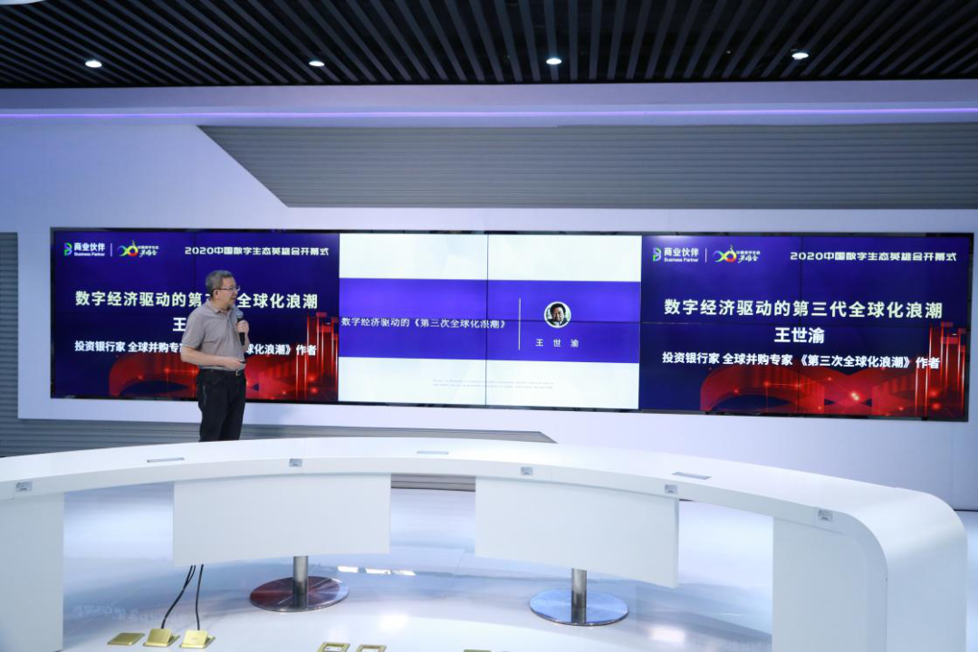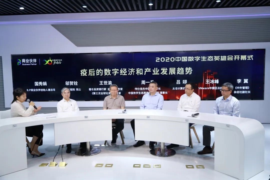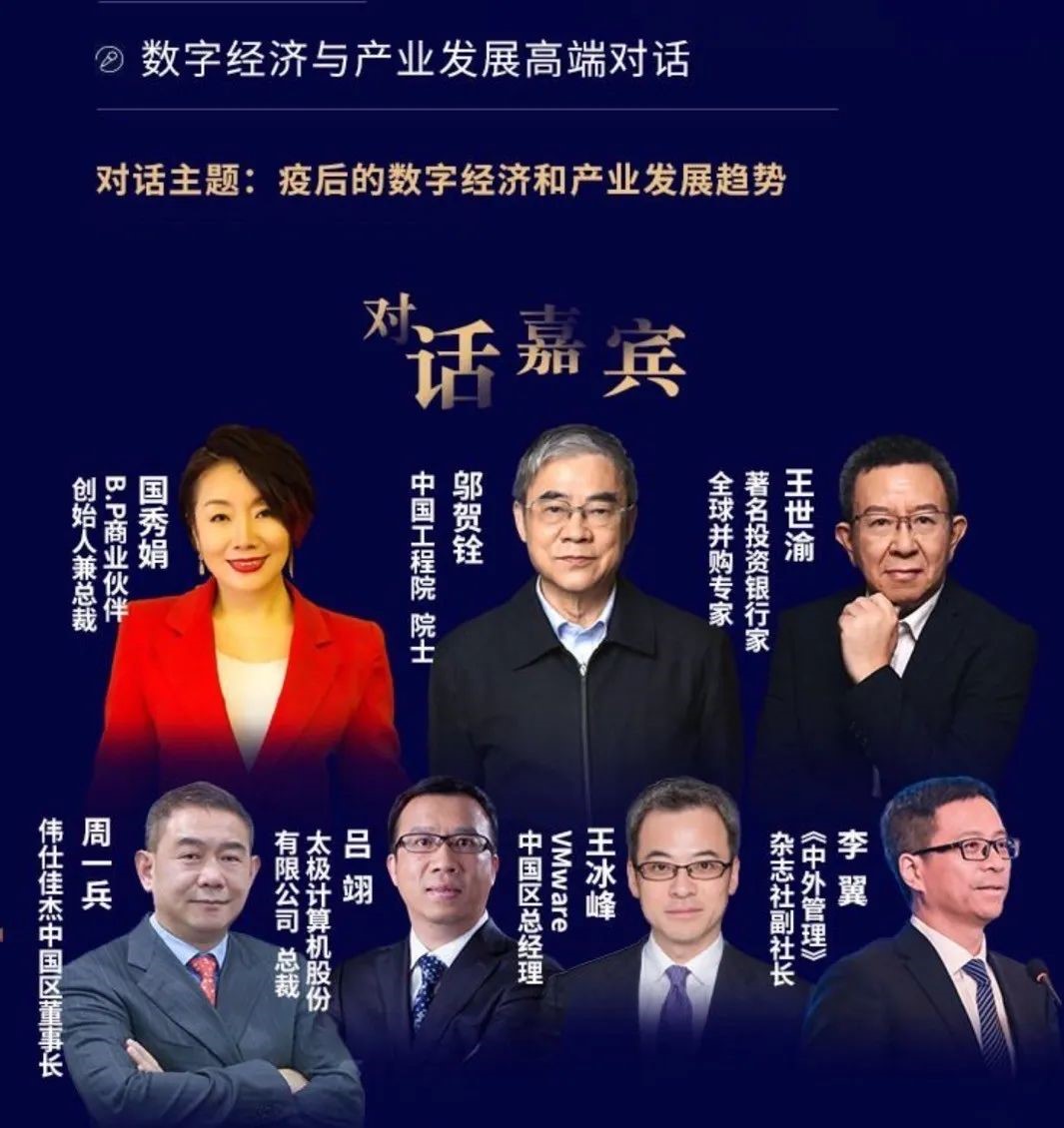 在主题为《疫后的数字经济和产业发展趋势》的高端对话中,邬贺铨院士、世界并购专家王世渝、伟仕佳杰中国区董事长、中国数字生态英雄会俱乐部理事长周一兵、太极计算机股份有限公司总裁吕翊、中外管理杂志社副社长李翼,畅谈了疫情对全球经济的影响以及未来发展的趋势。