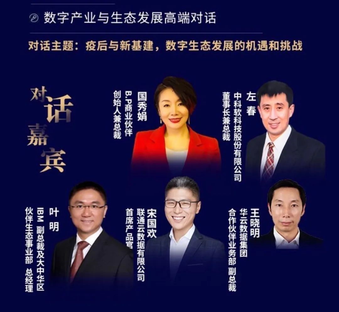 在主题为《2020,数字生态的机遇与挑战》的高端对话中,IBM全球副总裁、IBM大中华区生态事业部总经理叶明,中科软科技股份有限公司董事长兼总裁左春,华云数据集团渠道业务部副总裁王晓明,联通沃云首席产品官宋国欢发表了精彩的真知灼见。