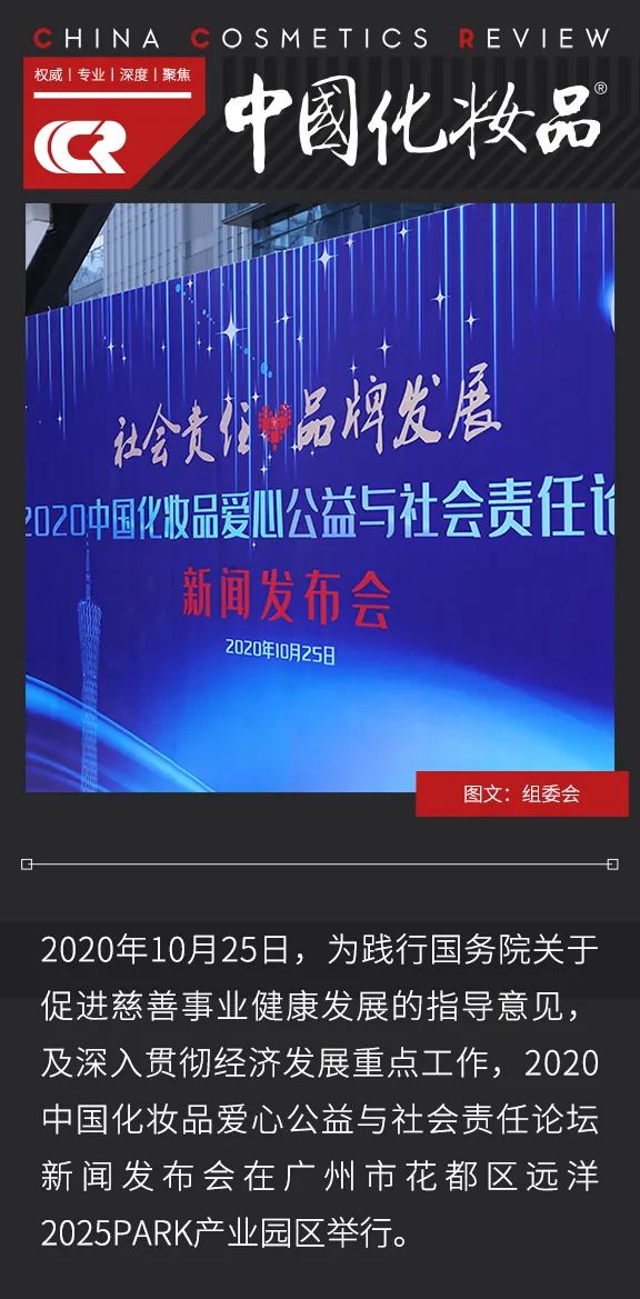 2020年10月25日,为践行国务院关于促进慈善事业健康发展的指导意见,及深入贯彻经济发展重点工作,2020中国化妆品爱心公益与社会责任论坛新闻发布会在广州市花都区远洋2025park产业园区举行。