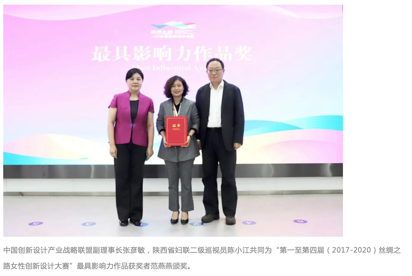10月25日,第四届丝绸之路女性创新设计大赛颁奖仪式在“2020丝绸之路创新设计论坛”上成功举办。中国创新设计产业战略联盟副理事长、中国机械工程学会副理事长张彦敏、陕西省妇联副主席马洁、省妇联二级巡视员陈小江、陕西省生态环境厅人事处调研员李玲、陕西省工业和信息化厅产业政策处一级调研员宋亚朝、西安市妇联副主席岳岚、碑林区区委书记刘其智等省市区相关部门领导及大赛获奖者代表参加。来自海峡两岸及"一带一路”沿线国家和地区代表在线上出席。与会代表共同探讨了疫情下“一带一路”创新设计发展新路径和新模式。