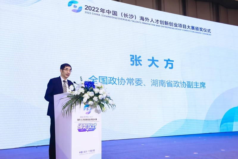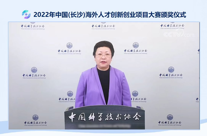 2022年11月25日,2022年中国(长沙)海外人才创新创业项目大赛颁奖仪式在北京、湖南两地以线上线下相结合形式成功举办。中国科协党组成员兼国际合作部部长罗晖线上出席并致辞,全国政协常委、湖南省政协副主席张大方现场出席活动并讲话。大赛评审委员会主任、中国科学院院士高福等专家出席活动并颁奖,中国科协及湖南省有关领导、院士专家、投资机构负责人、参赛项目代表等共200余人在线上线下参加了颁奖活动。