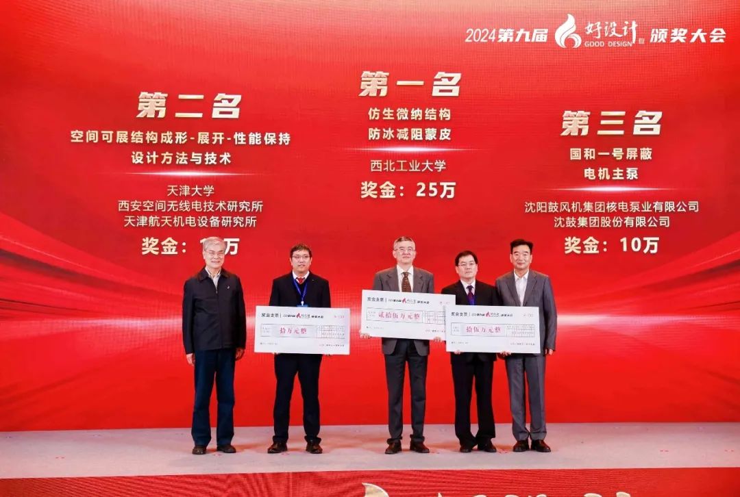 潘云鹤院士与浙江双环传动机械股份有限公司董事长吴长鸿先生共同为2024“好设计”奖前三名的项目颁发奖金。仿生微纳结构防冰减阻蒙皮、空间可展结构成形-展开-性能保持设计方法与技术、国和一号屏蔽电机主泵三个项目分别获得25万、15万和10万元奖金。