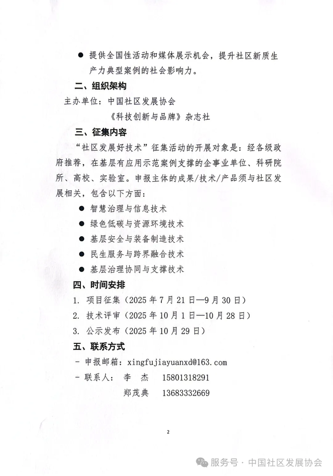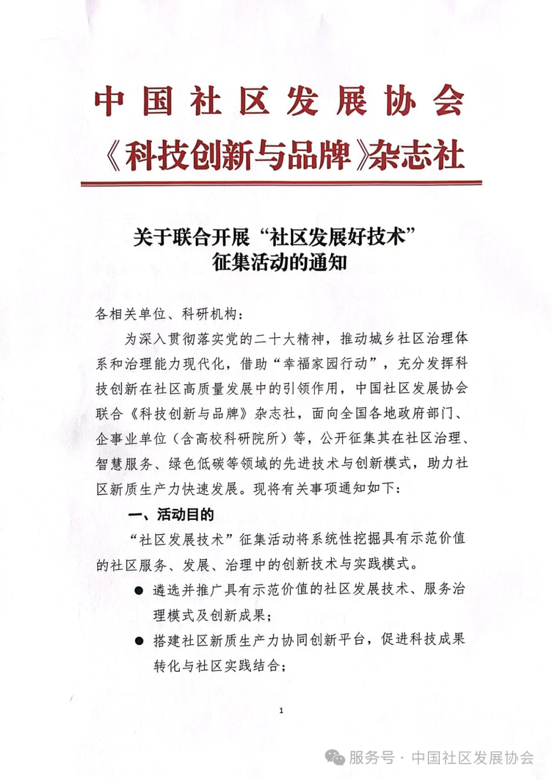 为深入贯彻落实党的二十大精神,推动城乡社区治理体系和治理能力现代化,借助“幸福家园行动”,充分发挥科技创新在社区高质量发展中的引领作用,中国社区发展协会联合《科技创新与品牌》杂志社,面向全国各地政府部门、企事业单位(含高校科研院所)等,公开征集其在社区治理智慧服务、绿色低碳等领域的先进技术与创新模式,助力社区新质生产力快速发展。现将有关事项通知如下: