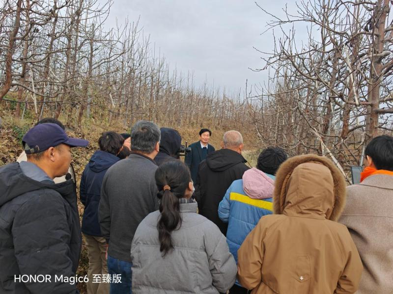 座谈会后,专家服务团一行前往玉泉山种植合作社梨、苹果种植基地开展现场技术指导。在田间地头,张强研究员针对苹果种植中的精细化管理技术,从土肥水管理、花期调控到果实套袋、采后商品化处理等环节进行细致讲解;张鹤研究员为农户提供采收时机选择、预处理方法等实操建议;张玉星教授则围绕梨树种形修剪、病虫害绿色防控等优质栽培技术进行现场示范,并推荐了适宜当地气候土壤条件的优良品种。专家们手把手教学、面对面答疑,将先进技术和前沿理念送到田间地头,让农户们受益匪浅。