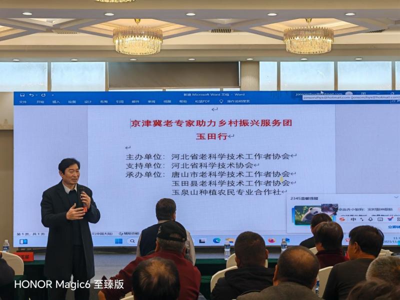为响应党的二十届四中全会关于发展品牌农业、推动乡村全面振兴的号召,2025 年 11 月 24 日,“京津冀老专家助力乡村振兴服务团玉田行” 活动在玉田县成功举办。本次活动由河北省老科学技术工作者协会主办,河北省科学技术协会支持,唐山市老科学技术工作者协会、玉田县老科学技术工作者协会及唐山玉田县玉泉山种植农民专业合作社联合承办,三位京津冀地区果树与农产品保鲜领域的权威专家齐聚一堂,为当地农业产业发展注入强劲科技动能。