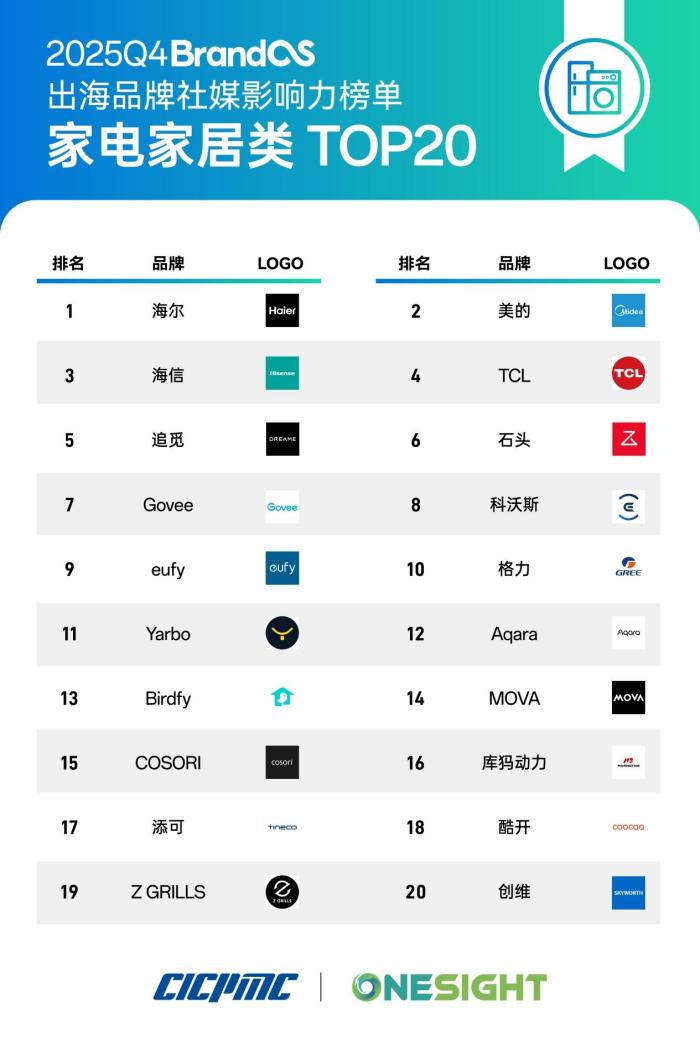 为贯彻落实党中央、国务院关于推动和服务中国企业出海的战略决策,2026年1月20日,经中国国际跨国公司促进会监制及其战略合作伙伴中国品牌出海领导者OneSight联合发布的2025Q4《BrandOS出海品牌社媒影响力榜单》正式揭晓。该榜单以“数据公开透明性+行业适配性”为核心原则,提供覆盖消费电子、汽车、家电家居、新能源、智能制造等8大核心领域的榜单,直观反映品牌在全球化进程中的阶段性成果。
