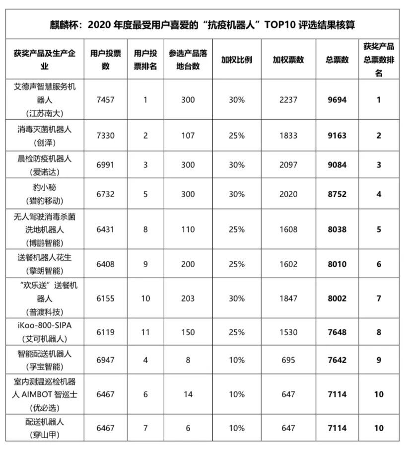 结果出炉!麒麟杯:2020年度最受用户喜爱的“抗疫机器人”TOP10评选获奖名单公布