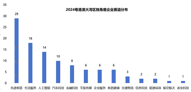 在赛道分布上,粤港澳大湾区独角兽企业主要集中于先进制造、生活服务、人工智能、汽车科技和金融科技等领域。